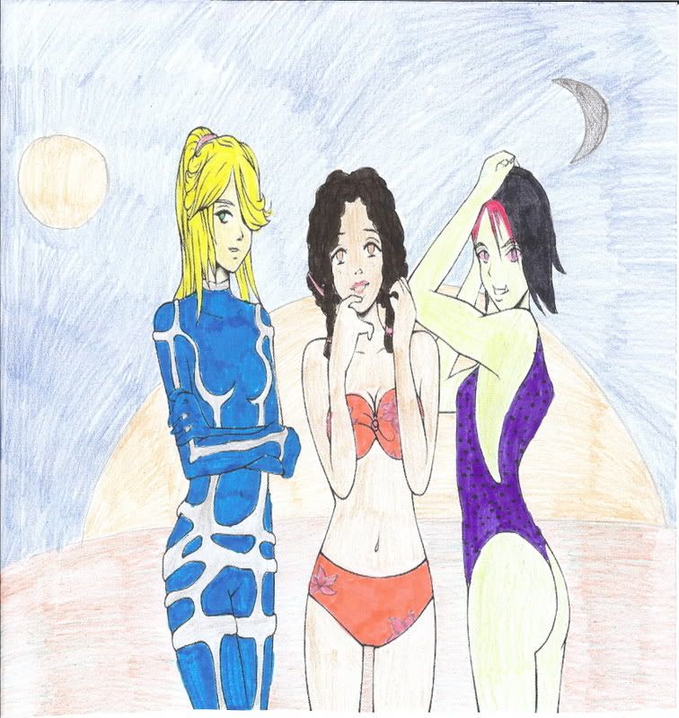 If you have any questions, let me know! The picture that you will be coloring is called "At the Beach" and is a gag picture I made as a joke for my friend Steph. She and I are always joking that if I keep being so mean to my story characters, one of these days I'm gonna get a note saying: "Dear Mara, we're sick of all this angst, so we decided to just skip all this crap, waste Future Jimmy's planet, and go on vacation to Hawaii. Signed, Aurora, Libby, and April" or something like that. Haha, anyway, here is the lineart: