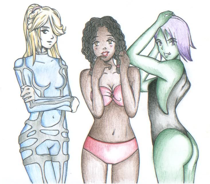 I would like to begin by pointing out that pastels are the single most difficult medium with which to color a picture EVER. :wacko: No kidding. You are very brave for having used them, and you actually did a nice job. I like how you made the tubing on Aurora’s suit multi-toned…a nice break from the traditional silver. My other favorite part of this picture is April’s green hair (heck, why not, everything else on Gorlocks is green, right? ;) ) and her two-toned, light colored bathing suit. It’s a very pretty color mix, and very different from the other entries. Nice creativity! PS. your character was my fave – not to mention he was the only male character submitted! We sure are reverse sexist on this board! LOL